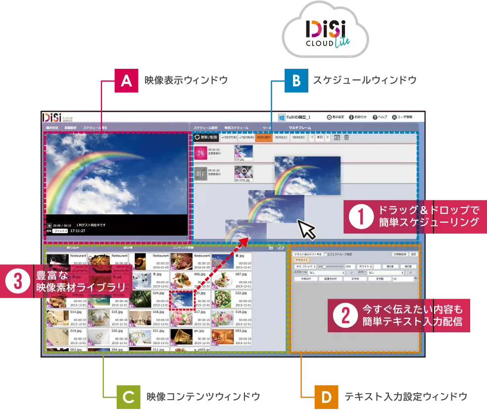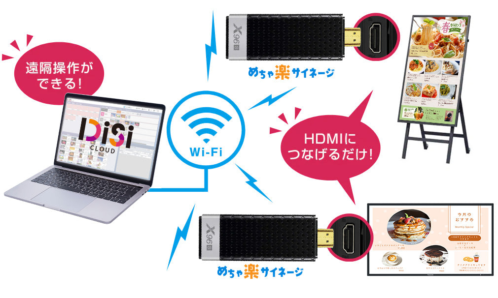 めちゃ楽サイネージはモニタに差して接続するだけ、DiSiクラウドの操作もドラッグ&ドロップ操作カンタン更新できます。